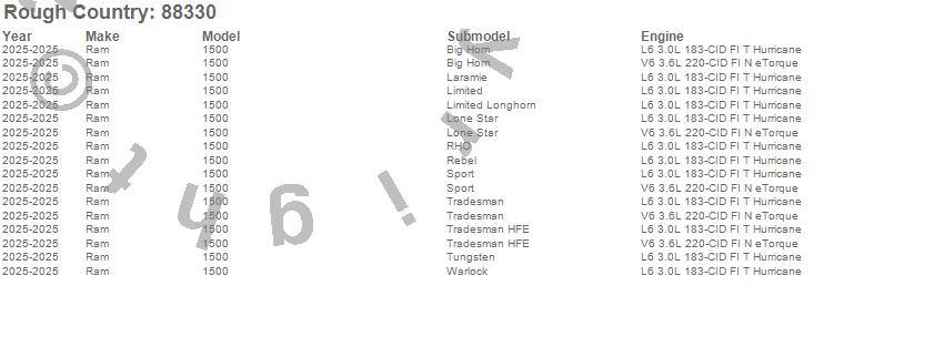 Brand: Rough CountryPart Number: 88330Lift Kit-Suspension w/Shock Type: 6 in. Lift - Premium N3 ShocksUPC: 840269952326
