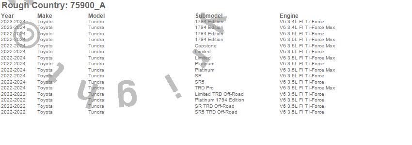 Below is an abbreviated list of applications for the Suspension Lift Kit.Tundra, Toyota, 2024, 2023, 2022