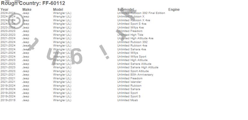 Brand: Rough CountryPart Number: FF-60112Floor Mat Set Type: Front and RearUPC: 840269950780