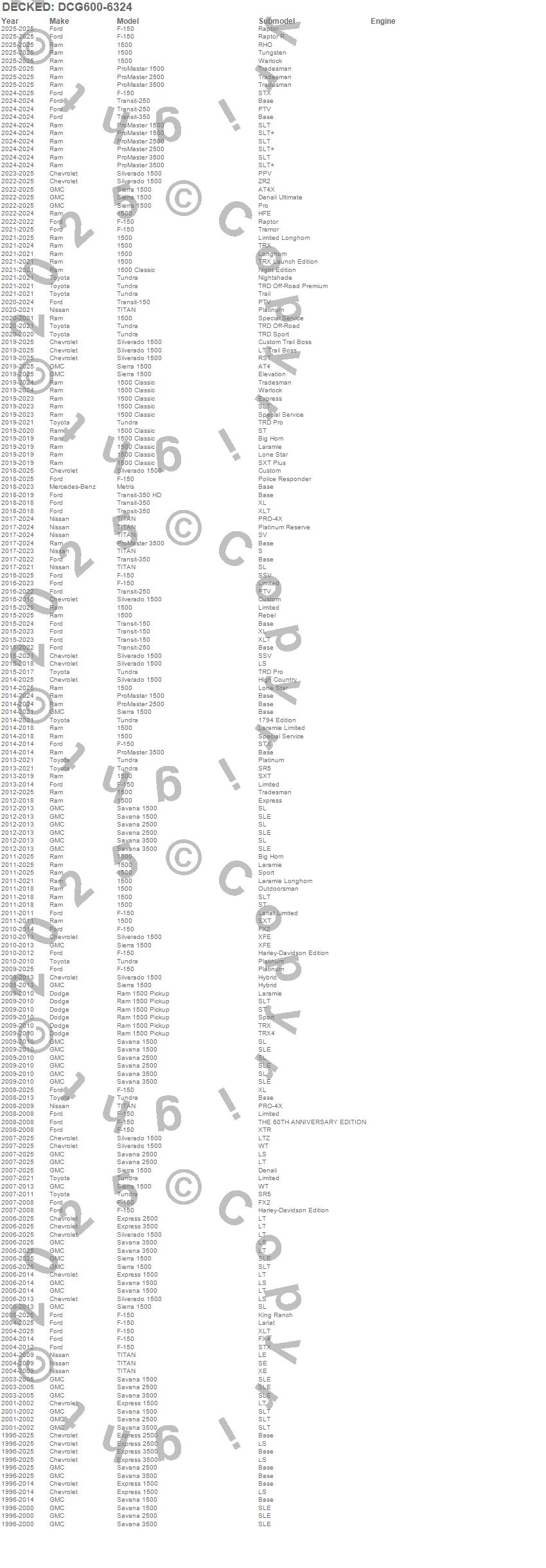 Brand: DECKEDPart Number: DCG600-6324Rollout Cargo Bed Type: 63 x 24 in. - 75 Percent Extension - 600 lbs. CapacityUPC: 815294024621