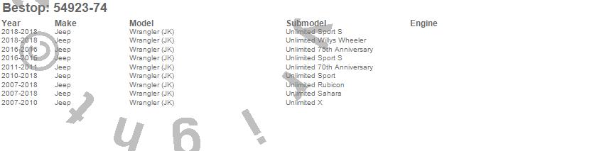 Below is an abbreviated list of applications for the Trektop Glide Slantback Soft Top.Wrangler (JK), Jeep, 2018, 2017, 2016, 2015, 2014, 2013, 2012, 2011, 2010, 2009, 2008, 2007