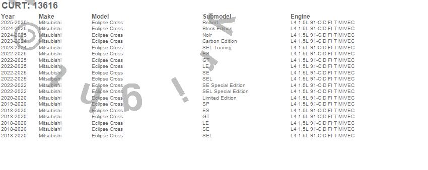 Below is an abbreviated list of applications for the Class III 2 in. Receiver Hitch.Eclipse Cross, Mitsubishi, 2026, 2025, 2024, 2023, 2022, 2020, 2019, 2018