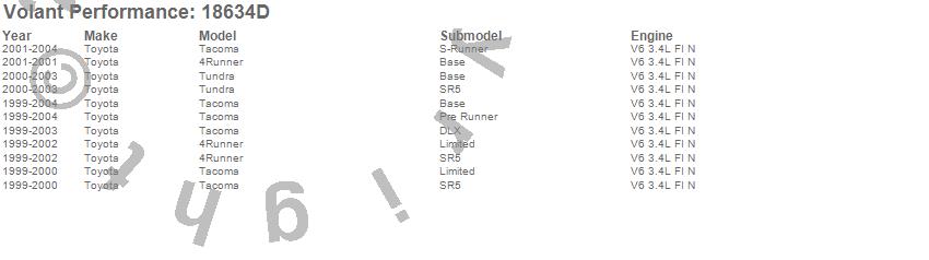 Below is an abbreviated list of applications for the DryTech Filter Closed Box Air Intake.4Runner, Tacoma, Tundra, Toyota, 2004, 2003, 2002, 2001, 2000, 1999