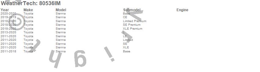 Below is an abbreviated list of applications for the Side Window Deflector.Sienna, Toyota, 2020, 2019, 2018, 2017, 2016, 2015, 2014, 2013, 2012, 2011