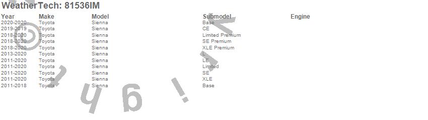 Below is an abbreviated list of applications for the Side Window Deflector.Sienna, Toyota, 2020, 2019, 2018, 2017, 2016, 2015, 2014, 2013, 2012, 2011