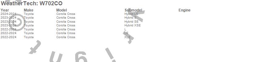 Below is an abbreviated list of applications for the All Weather Floor Mats.Corolla Cross, Toyota, 2026, 2024, 2023, 2022