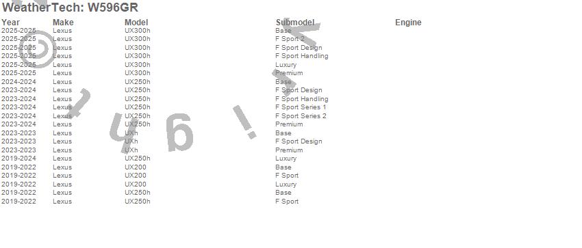 Below is an abbreviated list of applications for the All Weather Floor Mats.UX200, UX250h, UX300h, UXh, Lexus, 2025, 2024, 2023, 2022, 2021, 2020, 2019