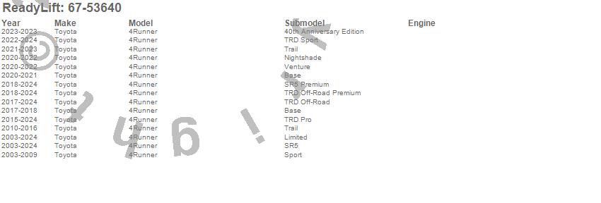 Below is an abbreviated list of applications for the Control Arm.4Runner, Toyota, 2025, 2024, 2023, 2022, 2021, 2020, 2019, 2018, 2017, 2016, 2015, 2014, 2013, 2012, 2011, 2010, 2009, 2008