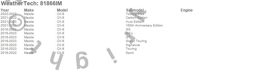 Below is an abbreviated list of applications for the Side Window Deflector.CX-9, Mazda, 2023, 2022, 2021, 2020, 2019, 2018, 2017, 2016