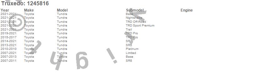 Below is an abbreviated list of applications for the Pro X15 TS Tonneau Cover.Tundra, Toyota, 2021, 2020, 2019, 2018, 2017, 2016, 2015, 2014, 2013, 2012, 2011, 2010, 2009, 2008, 2007