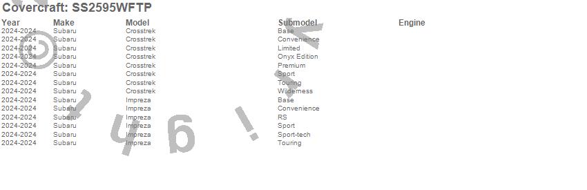 Below is an abbreviated list of applications for the SeatSaver Custom Seat Cover.Crosstrek, Impreza, Subaru, 2025, 2024