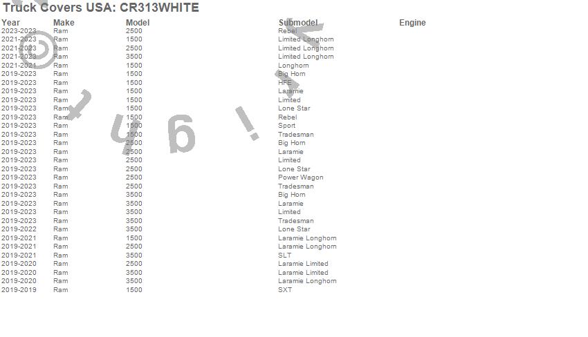 Brand: Truck Covers USAPart Number: CR313WHITETonneau Cover Type: 74 in. - White Powder Coat - SquaredUPC: 887753770738