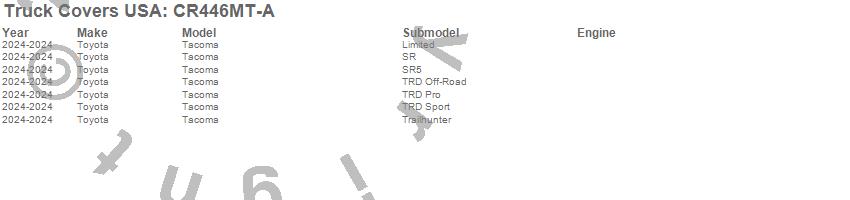 Brand: Truck Covers USAPart Number: CR446MT-ATonneau Cover Type: 60 in. - Matte FinishUPC: 887753979049