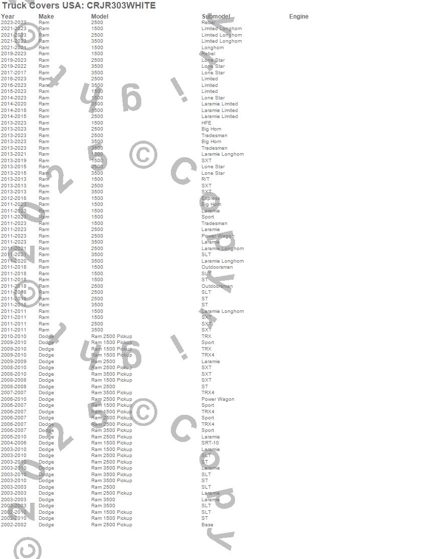 Below is an abbreviated list of applications for the American Work Cover JR..1500, 2500, 3500, Ram 1500, Ram 2500, Ram 3500, Dodge, Ram, 2023, 2022, 2021, 2020, 2019, 2018, 2017, 2016, 2015, 2014, 2013, 2012