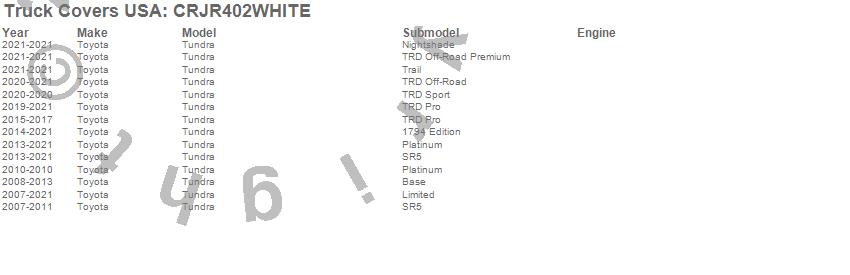 Below is an abbreviated list of applications for the American Work Cover JR..Tundra, Toyota, 2021, 2020, 2019, 2018, 2017, 2016, 2015, 2014, 2013, 2012, 2011, 2010, 2009, 2008, 2007