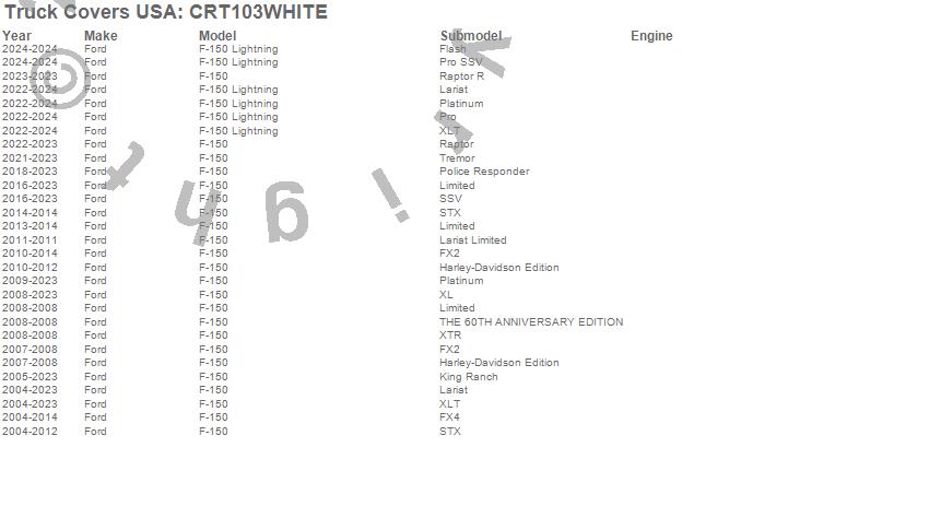 Brand: Truck Covers USAPart Number: CRT103WHITETonneau Cover Type: 66 in. - White Powder CoatUPC: 887753772954