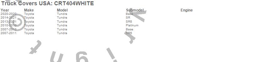Brand: Truck Covers USAPart Number: CRT404WHITETonneau Cover Type: 96 in. - White Powder CoatUPC: 887753773852