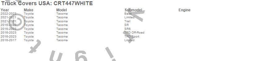 Brand: Truck Covers USAPart Number: CRT447WHITETonneau Cover Type: 73 in. - White Powder CoatUPC: 887753773975