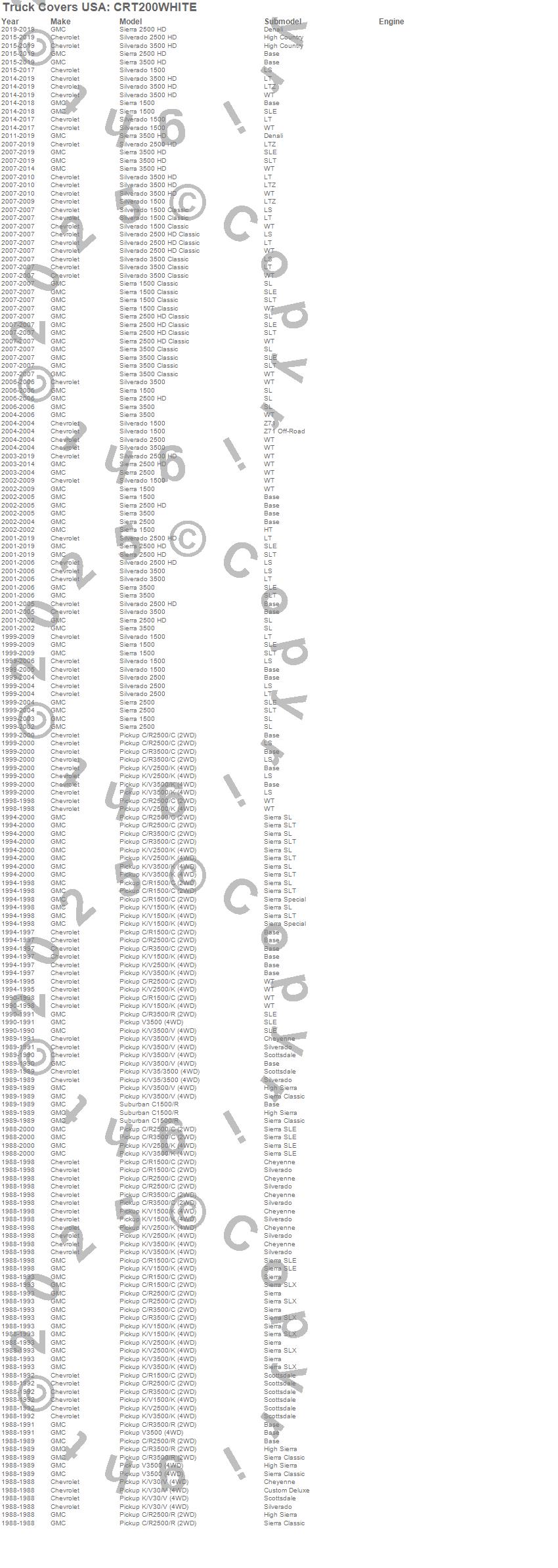 Below is an abbreviated list of applications for the American Work Cover.C1500 Pickup, C2500 Pickup, C3500 Pickup, K1500, K1500 Pickup, K2500 Pickup, K3500 Pickup, R2500 Pickup, R3500 Pickup, Sierra 1500, Sierra 1500 Classic, Sierra 2500, Sierra 2500 HD, Sierra 2500 HD Classic, Sierra 3500, Sierra 3500 Classic, Sierra 3500 HD, Silverado 1500, Silverado 1500 Classic, Silverado 2500