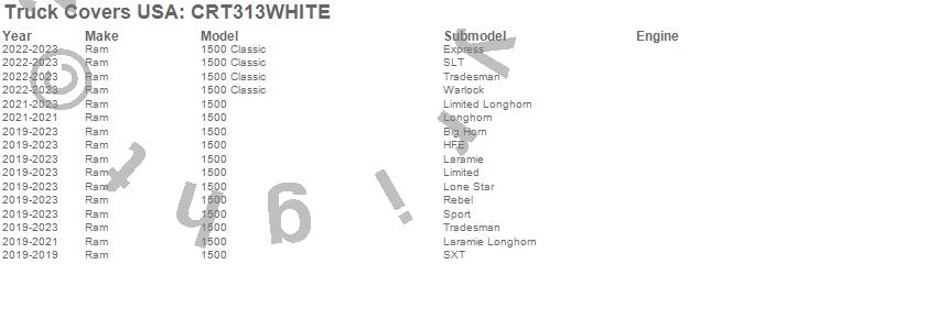 Brand: Truck Covers USAPart Number: CRT313WHITETonneau Cover Type: 74 in. - White Powder Coat - SquaredUPC: 887753773708