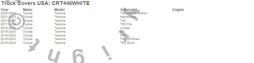 Brand: Truck Covers USAPart Number: CRT446WHITETonneau Cover Type: 60 in. - White Powder CoatUPC: 887753773944