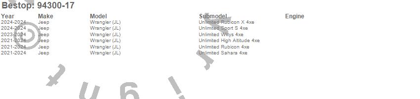 Below is an abbreviated list of applications for the Bestop SUV Top.Wrangler, Wrangler (JL), Jeep, 2026, 2025, 2024, 2023, 2022, 2021, 2020, 2019, 2018