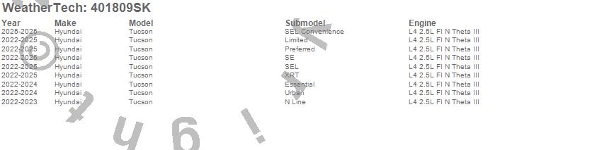 Below is an abbreviated list of applications for the Cargo Liner w/Bumper Protector.Tucson, Hyundai, 2025, 2024, 2023, 2022