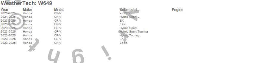 Below is an abbreviated list of applications for the All Weather Floor Mats.CR-V, Honda, 2026, 2025, 2024, 2023