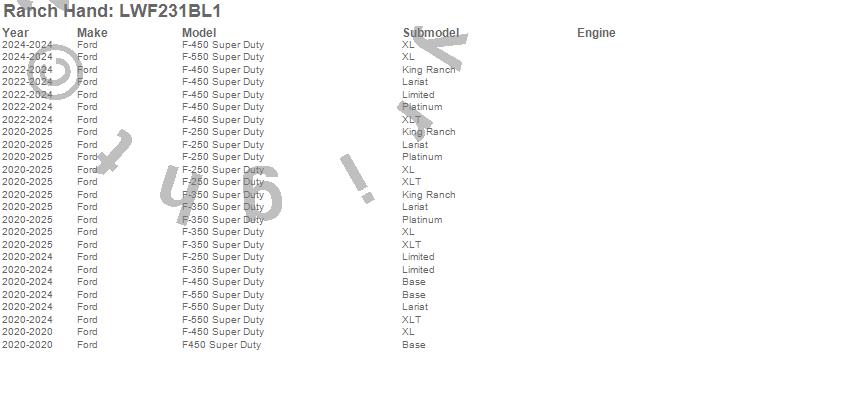 Below is an abbreviated list of applications for the Legend Series Grille Guard.F-250 Super Duty, F-350 Super Duty, F-450 Super Duty, F-550 Super Duty, F450 Super Duty, Ford, 2025, 2024, 2023, 2022, 2021, 2020