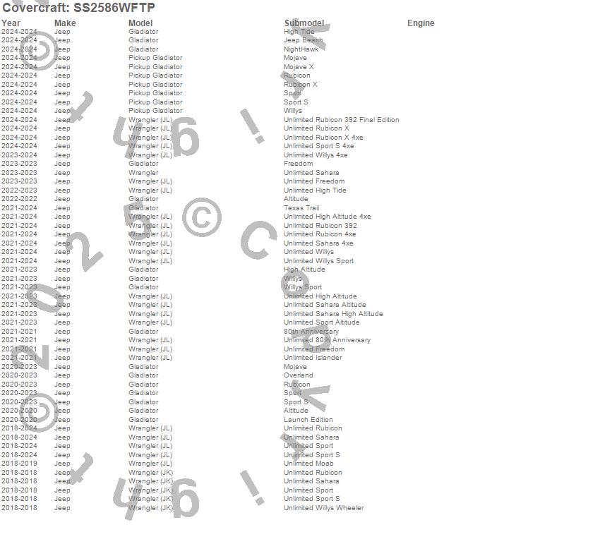 Below is an abbreviated list of applications for the SeatSaver Custom Seat Cover.Gladiator, Pickup Gladiator, Wrangler, Wrangler (JK), Wrangler (JL), Jeep, 2025, 2024, 2023, 2022, 2021, 2020, 2019, 2018