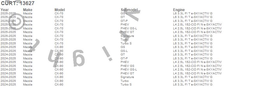 Below is an abbreviated list of applications for the Class III 2 in. Receiver Hitch.CX-70, CX-90, Mazda, 2025, 2024
