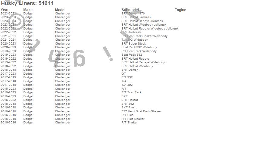 Below is an abbreviated list of applications for the X-act Contour Floor Liner.Challenger, Dodge, 2023, 2022, 2021, 2020, 2019, 2018, 2017, 2016