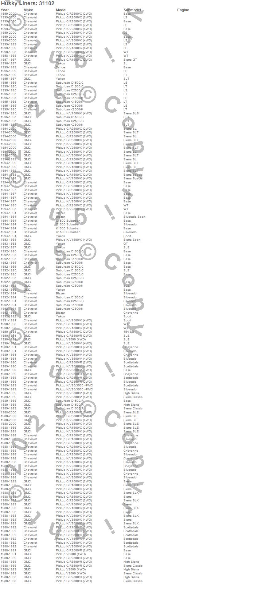 Below is an abbreviated list of applications for the Classic Style Floor Liner.Blazer, C1500 Pickup, C1500 Suburban, C2500 Pickup, C2500 Suburban, C3500 Pickup, K1500, K1500 Pickup, K1500 Suburban, K2500 Pickup, K2500 Suburban, K3500 Pickup, R2500 Pickup, R3500 Pickup, Tahoe, V3500 Pickup, Yukon, Chevrolet, GMC, 2000