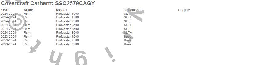 Below is an abbreviated list of applications for the Covercraft Carhartt SeatSaver.ProMaster 1500, ProMaster 2500, ProMaster 3500, Ram, 2025, 2024, 2023