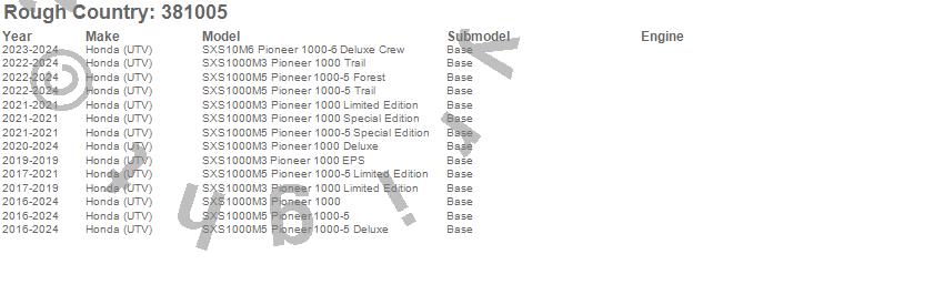 Brand: Rough CountryPart Number: 381005Shock Absorber Type: Coil Over Shock Set - Honda Pioneer 1000-5/Pioneer 1000-6UPC: 840269964640