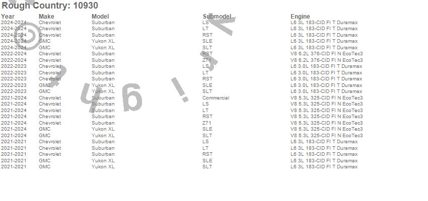 Below is an abbreviated list of applications for the Suspension Lift Kit.Suburban, Yukon XL, Chevrolet, GMC, 2024, 2023, 2022, 2021