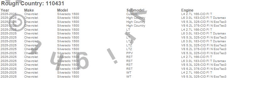Below is an abbreviated list of applications for the Suspension Lift Kit.Silverado 1500, Chevrolet, 2025