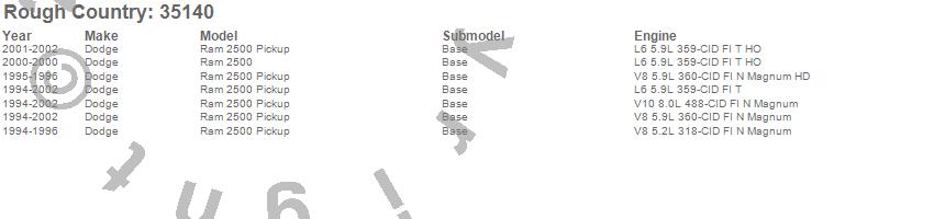 Below is an abbreviated list of applications for the Suspension Lift Kit.Ram 2500, Dodge, 2002, 2001, 2000, 1999, 1998, 1997, 1996, 1995, 1994
