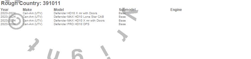 Brand: Rough CountryPart Number: 391011Lift Kit-Suspension Type: Adjustable Ride Height Adjust - Can-Am Defender HD10UPC: 840269966071