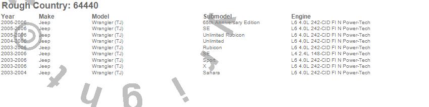 Below is an abbreviated list of applications for the Suspension Lift Kit.Wrangler (TJ), Jeep, 2006, 2005, 2004, 2003