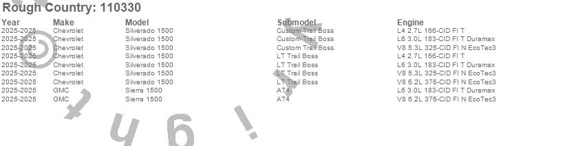 Brand: Rough CountryPart Number: 110330Lift Kit-Suspension Type: 4 in. Lift - AT4/TrailbossUPC: 840269966613
