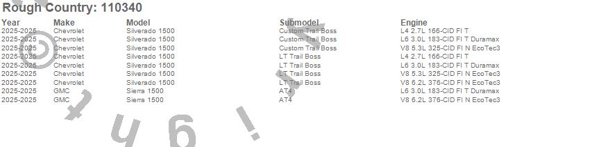 Brand: Rough CountryPart Number: 110340Lift Kit-Suspension Type: 4 in. Lift - AT4/Trailboss - M1/M1UPC: 840269966644