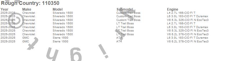 Brand: Rough CountryPart Number: 110350Lift Kit-Suspension Type: 4 in. Lift - AT4/Trailboss - VertexUPC: 840269966651