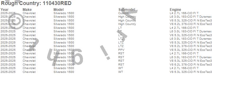Below is an abbreviated list of applications for the Suspension Lift Kit.Silverado 1500, Chevrolet, 2025