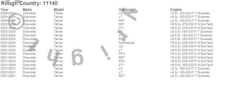 Below is an abbreviated list of applications for the Suspension Lift Kit.Tahoe, Chevrolet, 2024, 2023, 2022, 2021