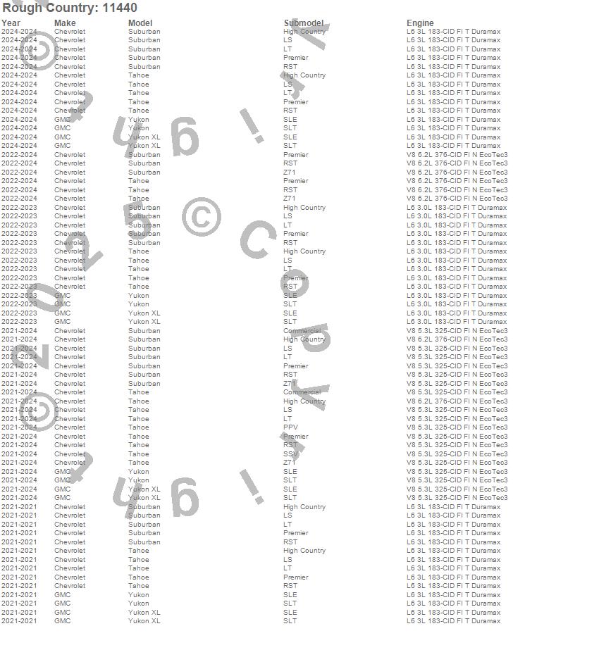 Below is an abbreviated list of applications for the Suspension Lift Kit.Suburban, Tahoe, Yukon, Yukon XL, Chevrolet, GMC, 2025, 2024, 2023, 2022, 2021