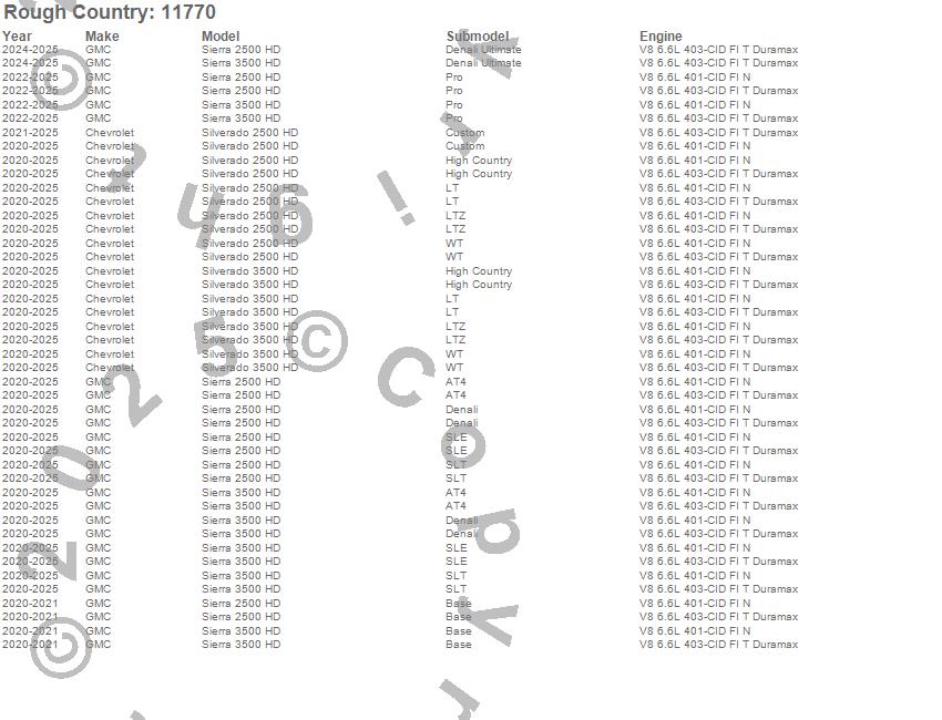 Below is an abbreviated list of applications for the Suspension Lift Kit.Sierra 2500 HD, Sierra 3500 HD, Silverado 2500 HD, Silverado 3500 HD, Chevrolet, GMC, 2025, 2024, 2023, 2022, 2021, 2020