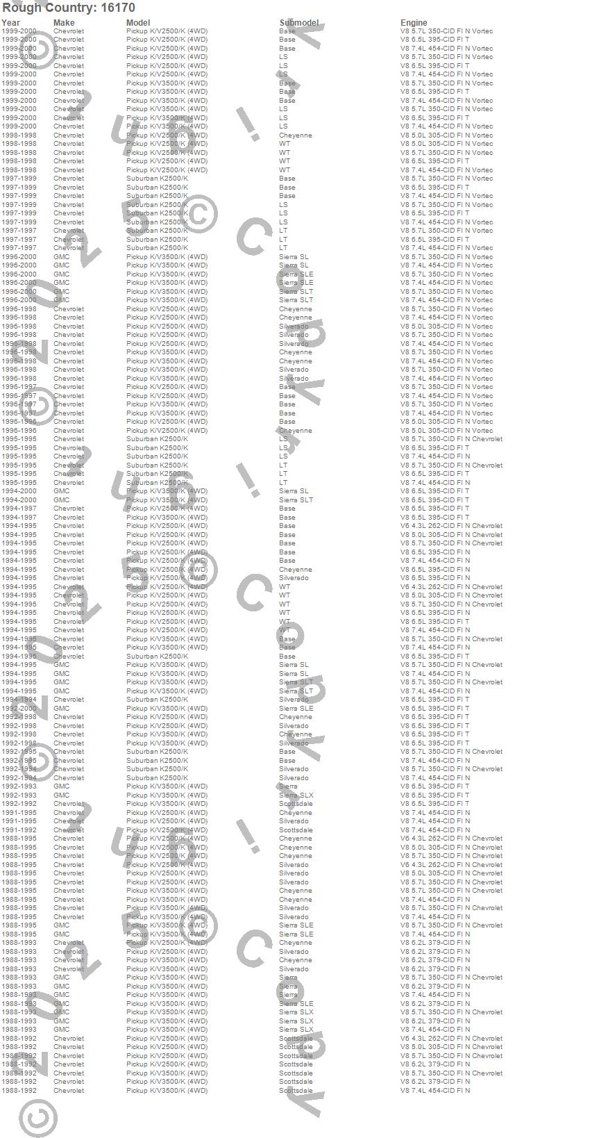 Below is an abbreviated list of applications for the Suspension Lift Kit.K2500 Pickup, K2500 Suburban, K3500 Pickup, Chevrolet, GMC, 2000, 1999, 1998, 1997, 1996, 1995, 1994, 1993, 1992, 1991, 1990, 1989, 1988