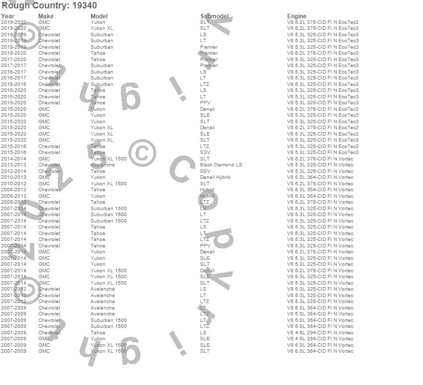 Below is an abbreviated list of applications for the Suspension Lift Kit.Avalanche, Suburban, Suburban 1500, Tahoe, Yukon, Yukon XL, Yukon XL 1500, Chevrolet, GMC, 2020, 2019, 2018, 2017, 2016, 2015, 2014, 2013, 2012, 2011, 2010