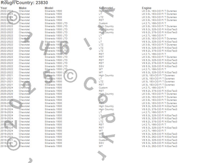 Below is an abbreviated list of applications for the Suspension Lift Kit.Silverado 1500, Silverado 1500 LTD, Chevrolet, 2024, 2023, 2022, 2021, 2020, 2019
